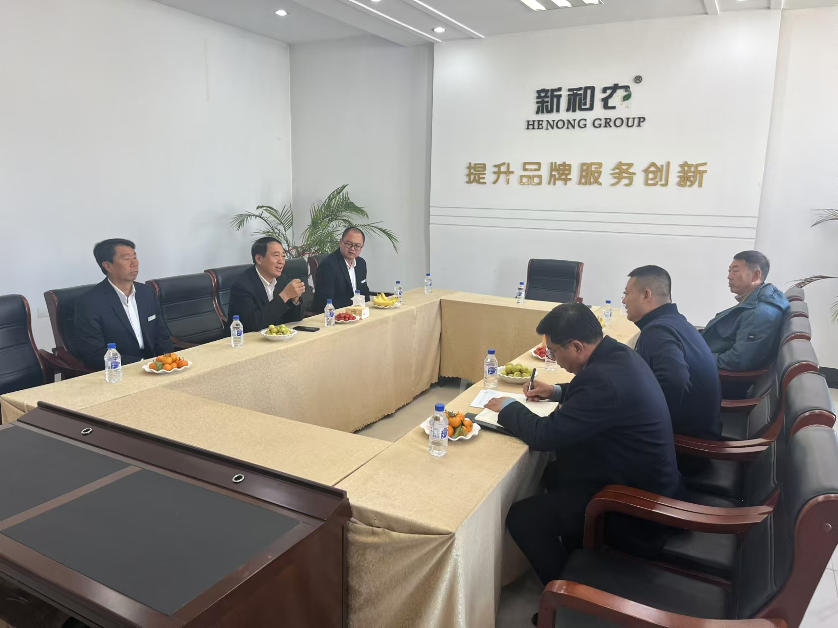 農(nóng)安農(nóng)商銀行行長王福堂,副行長劉仁,合隆行分行行長彭彬等一行5人到訪和農(nóng)牧業(yè)集團(tuán)蒞臨,和農(nóng)牧業(yè)集團(tuán)董事長方彥明先生熱情接待,雙方就加強(qiáng)業(yè)務(wù)合作進(jìn)行座談交流。